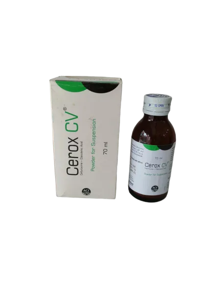 Cerox CV is an antibiotic suspension manufactured by ACI Limited, combining Cefuroxime Axetil (125 mg) and Clavulanic Acid (31.25 mg) per 5 ml. This combination enhances the efficacy of Cefuroxime by inhibiting beta-lactamase enzymes produced by certain bacteria, thereby extending its spectrum of activity.
